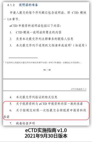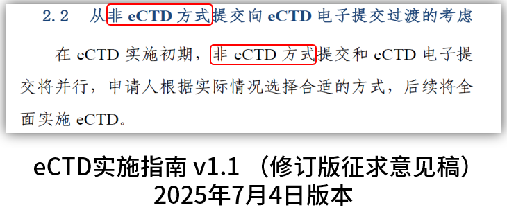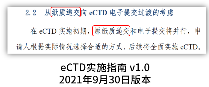 實施指南 v1.1 (修訂版征求意見稿)中將敘述中的“紙質遞交”調整為“非eCTD方式提交”