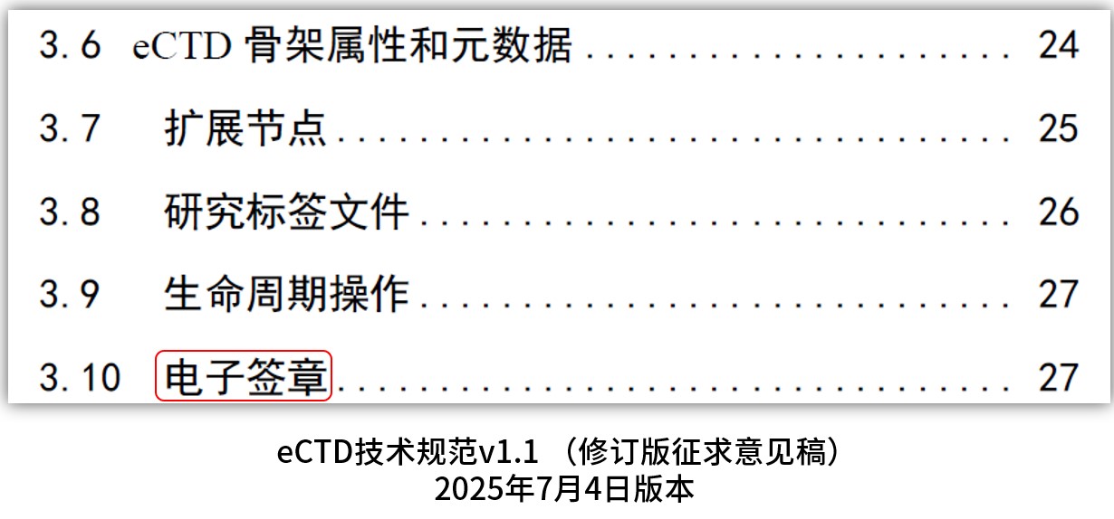eCTD技術規范 v1.1 (修訂版征求意見稿)以及eCTD實施指南 v1.1 (修訂版征求意見稿)將“電子簽名”調整為“電子簽章”,與現行其他法規一致。