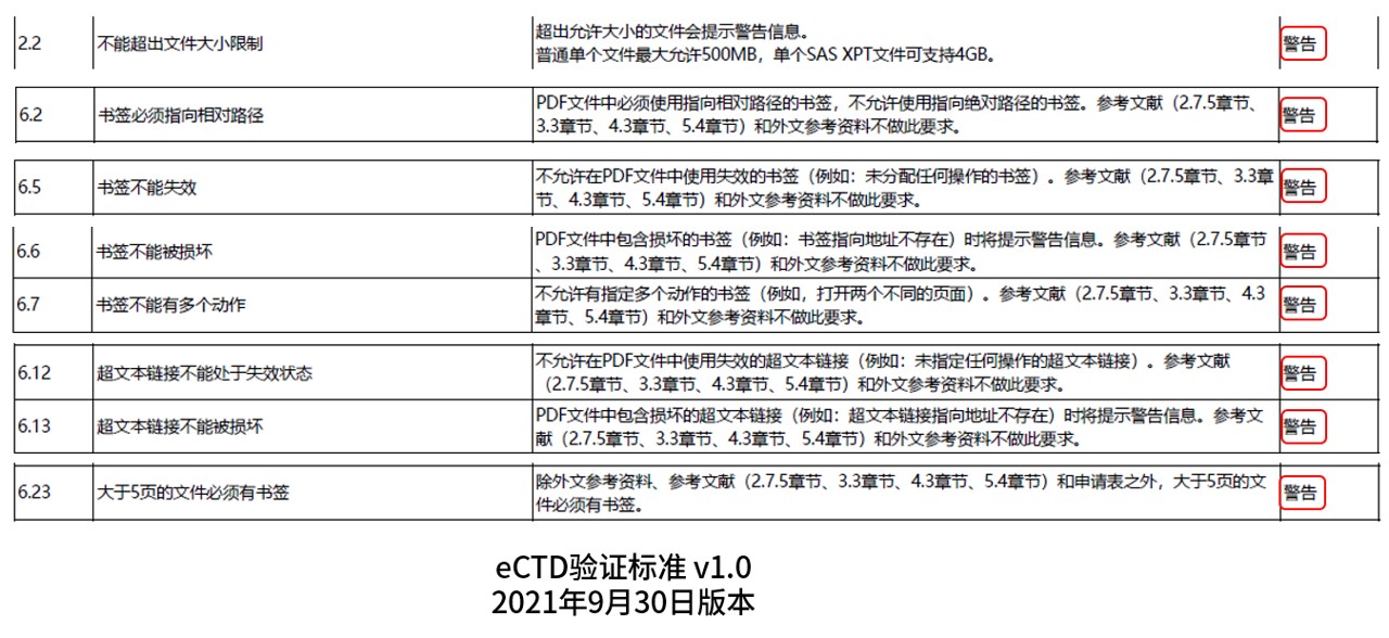 eCTD驗證標準 v1.1 (修訂版征求意見稿)中將8項與PDF相關的驗證項的嚴重程度從“警告”提升到“錯誤”