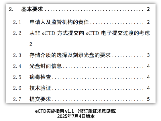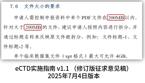 eCTD實施指南 v1.1 (修訂版征求意見稿)中將章節7.6中的單個文件大小從“500 MB”調整為“200 MB”