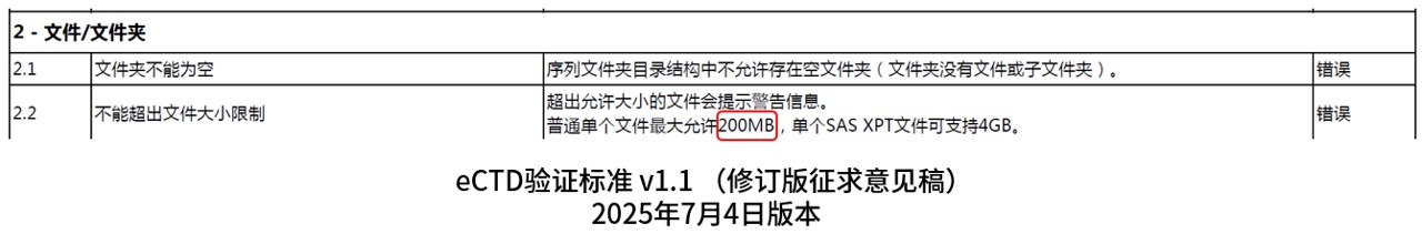 eCTD驗證標準 v1.1 (修訂版征求意見稿)中將2.2項中的單個文件大小從“500 MB”調整為“200 MB”