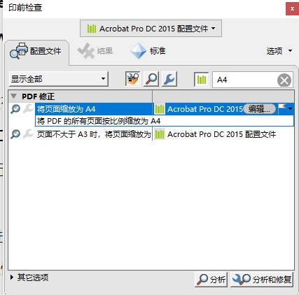 工具欄選擇“印刷制作-印前檢查-PDF修正”,選擇“將頁面縮放為A4”點擊“分析和修復(fù)”保存替換原文件即可。
