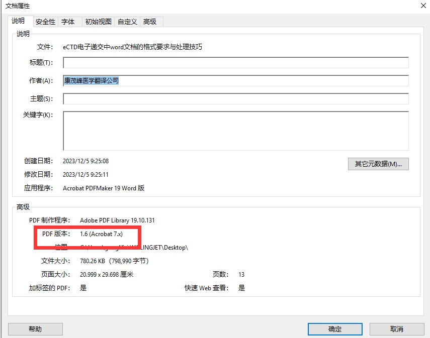 在工具欄中“文件-屬性”中查看PDF版本,1.4-1.7為符合遞交規(guī)范要求的版本。
