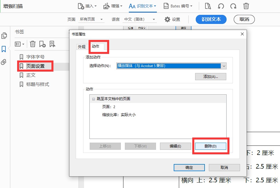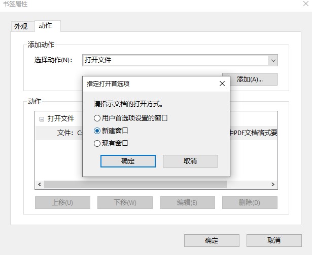 外部書簽的創(chuàng)建,需要對新建的書簽進行屬性設(shè)置,右鍵-屬性,將原有動作刪除后,點擊“動作-跳至頁面視圖”,點擊添加,打開目標文件找到目標頁,點擊“設(shè)置鏈接”按鈕。彈出書簽屬性框,點擊“動作-選擇動作-打開文件”,指定打開首選項選擇“新建窗口”點擊確定,使用頁碼選擇“承前縮放”,即可完成外部書簽的創(chuàng)建。