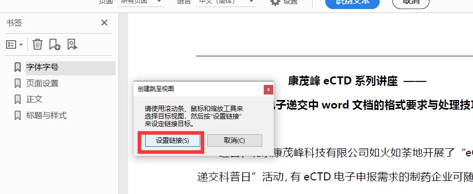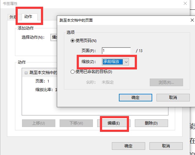 ICH規(guī)定將所有書簽屬性設(shè)置為“承前縮放”,點擊需要設(shè)置屬性的書簽,右鍵-屬性-動作-編輯-縮放,選擇“承前縮放”。