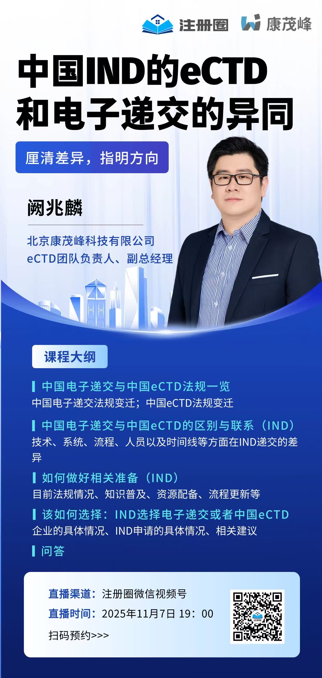 2025年11月7日,康茂峰公司副總經理、eCTD業務負責人闕兆麟先生受邀出席醫藥注冊領域權威平臺“注冊圈”的直播活動,圍繞《中國IND的eCTD和電子遞交的異同》主題展開深度分享。本次直播吸引了超三千名醫藥研發與注冊領域專業人士在線參與,現場互動熱烈,展現了行業對藥品電子化遞交政策的高度關注。