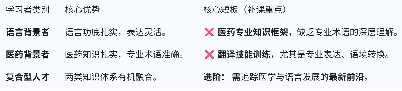 首先,你需要清晰定位自己,才能精準補齊短板。醫(yī)學翻譯學習路徑最大的特點就是學科交叉性。