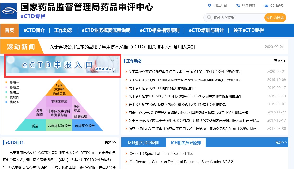 藥審中心官網新增的 eCTD 專欄,內容歸類更加清晰,不僅可以了解到 eCTD 的基本概念、eCTD 在中國的實施和發展以及 eCTD 培訓和研討的相關情況,還可以下載關于區域及ICH的相關指導原則文件。