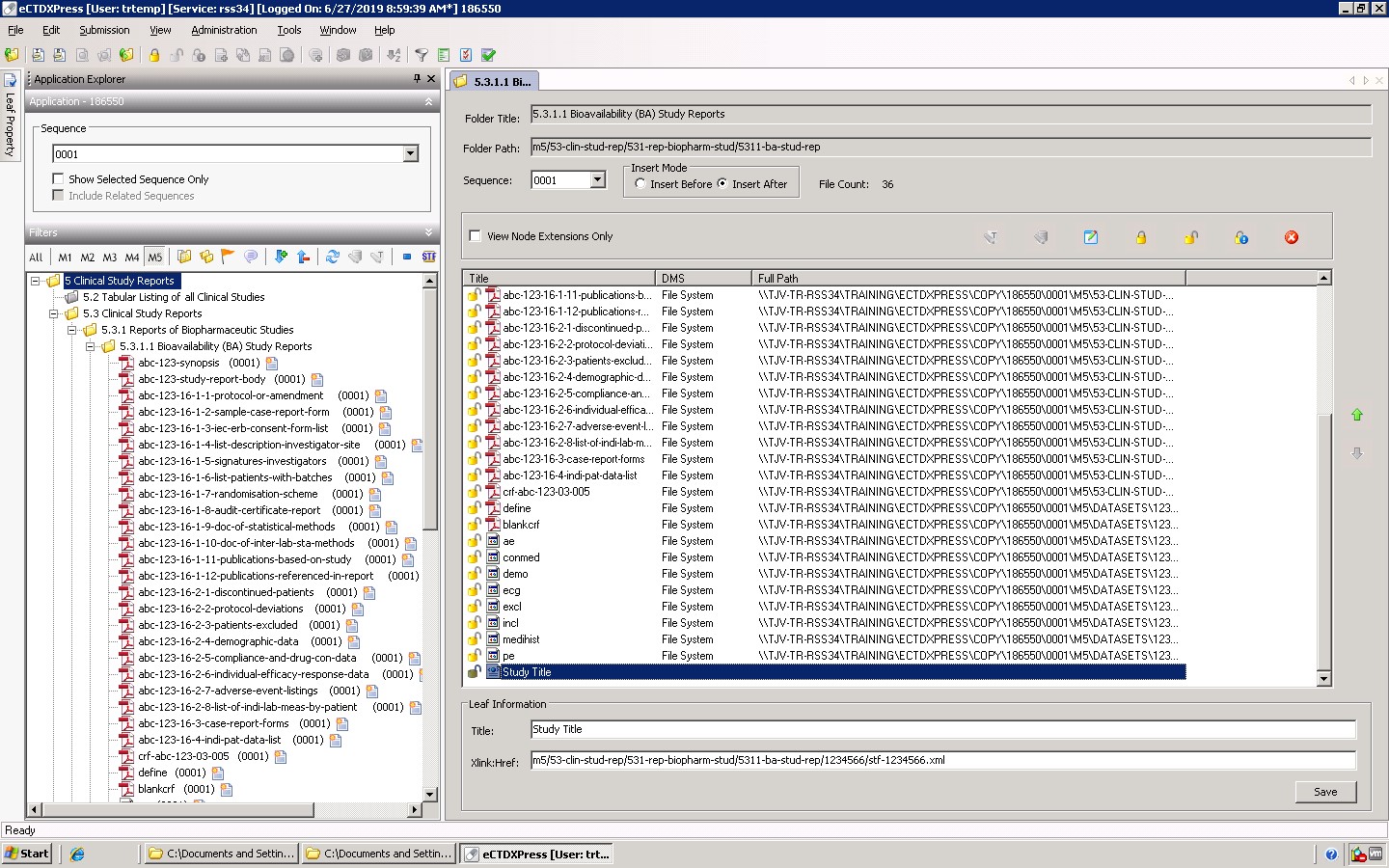 根據 Tracking Log 的具體信息,使用 eCTD 發布器對編輯后的文件進行 M1 至 M5 的文件上傳,建立符合 eCTD 要求的框架結構。根據 Tracking Log 對葉元素標題及文件名進行編輯,確保文件名符合 eCTD 規范。在 eCTD 文件結構中制作跨文件鏈接,建立 M4、M5 模塊研究標記文件(STF),每個 STF 包括種屬、文件分類標簽、研究報告標題和其他文件修訂信息的文件、文件位置和順序信息。