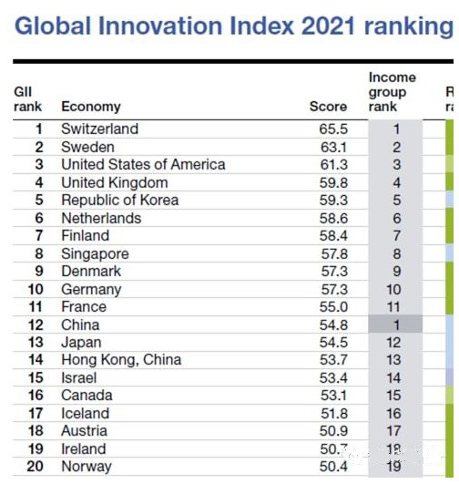 今年九月,世界知識產(chǎn)權(quán)組織(WIPO)也發(fā)布了《2021年全球創(chuàng)新指數(shù)》報告。報告指出,盡管新冠疫情持續(xù)發(fā)酵,但創(chuàng)新投資仍具有彈性,瑞士、瑞典、美國、英國和韓國位居全球創(chuàng)新指數(shù)排名前五,中國排名第 12。