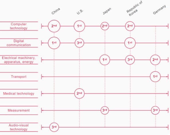 據(jù)產(chǎn)權(quán)組織統(tǒng)計數(shù)據(jù)庫的消息,中國和韓國的申請人在數(shù)字通信領(lǐng)域的專利申請較為密集,而美國的申請人在計算機技術(shù)領(lǐng)域申請的專利最多。對日本來說,頂尖的技術(shù)領(lǐng)域是電機,而對德國來說則是交通運輸。