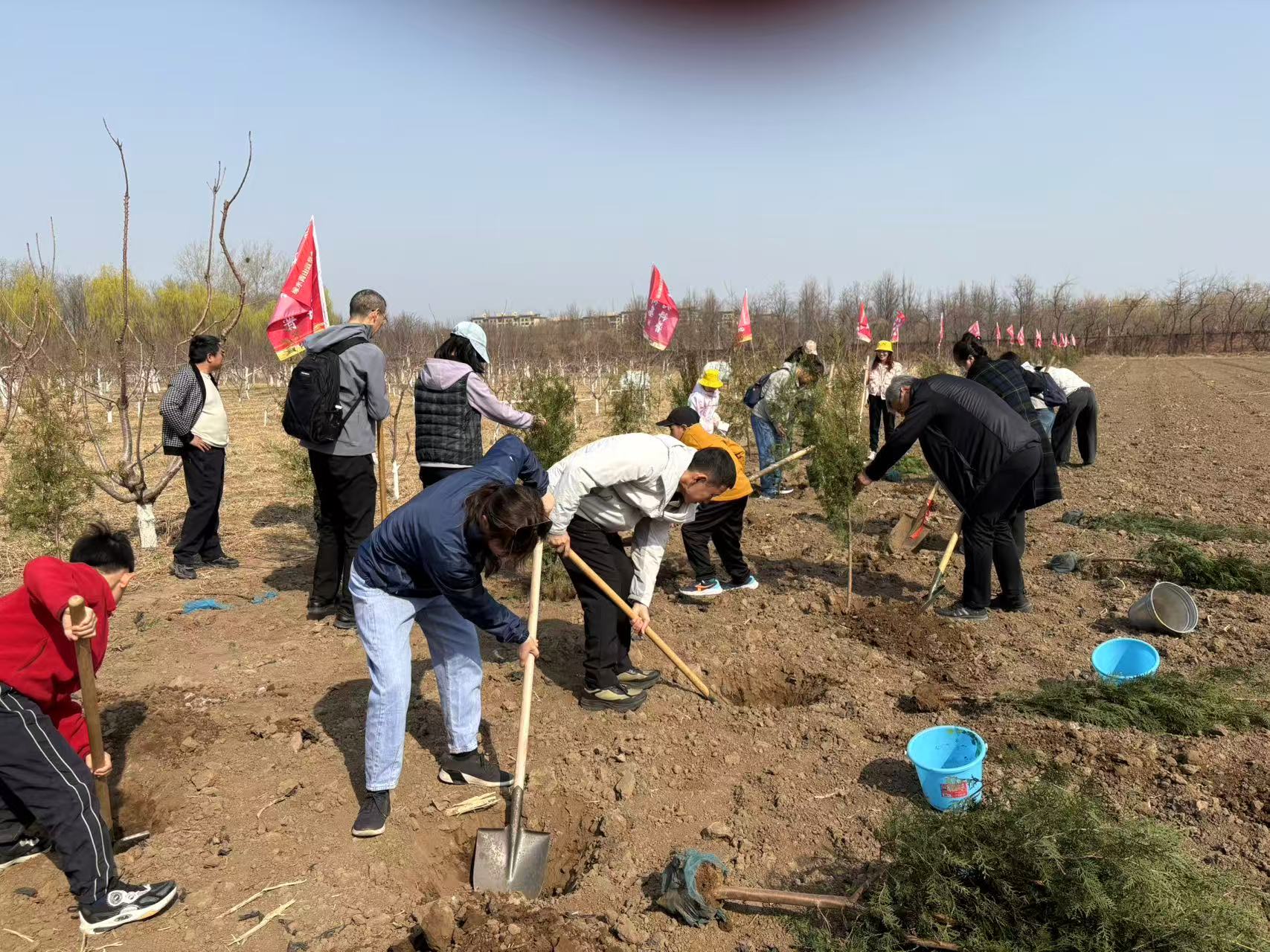 在植樹現場,大家熱情高漲、干勁十足。在聽取工作人員講解植樹要點后,大家紛紛領取樹苗、鐵鏟、水桶,投入到火熱的勞動中。揮鍬鏟土、扶苗填坑、提水澆灌,每一個環節都一絲不茍。秉承著“綠水青山就是金山銀山”的理念,大家用實際行動為首都的藍天事業貢獻自己的一份力量。經過一番辛勤勞作,一棵棵側柏樹苗在這片土地上“安家落戶”,在春風中展現出勃勃生機。